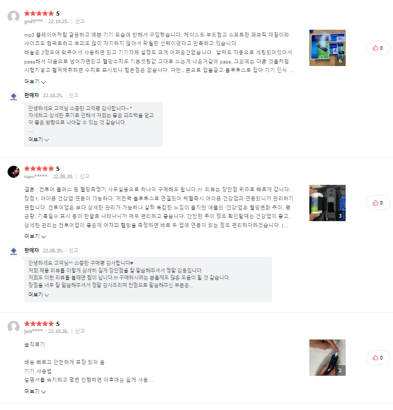 첫 번째로, 정확도가 높았는데 최종 결정 전 의료 쪽에 종사하고있는 아는 지인의 말씀을 들어보니 무엇보다 의료기기로 인증된걸 구매하는게 좋다고 하더라고요. 왜냐고 물어보았더니, 그래야 정확하게 확인이 가능하고, 오차가 크게 나지 않는다고 하여 살펴보다가 결정한것인데 제가 쓰는 혈당 측정기는 국내의료기기 인증이 당연하게 되어있어 정확성은 물론이거니와 여러번 측정해도 오차범위가 작아서 좋았어요.