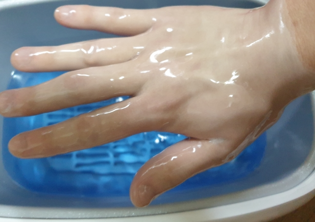 먼저 따뜻한 물에 손을 담가 근육을 이완시키고 물기를 완전히 말려주세요. 그리고 나서 파라핀 왁스 4~5개를 녹인 용액에 1~2초간 담갔다가 빼길 반복해주세요. 5번 정도 반복해주면 왁스가 손을 전체적으로 감싸주면서 열기로 인해 후끈해지는데, 여기 위에 비닐과 따뜻한 장갑까지 씌워주면 온열효과가 극대화돼서 손가락, 손목 관절에 큰 도움이 됩니다.