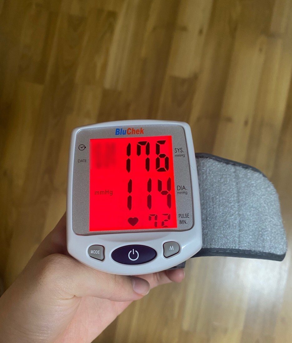 처음 재보니 155/98 정도의 숫자와 화면이 빨갛게 되어 위압감이 느껴졌었습니다 사용환경이나 시간에 따라 다르긴 하나 몇 번을 재봐도 높은 숫자가 계속 나왔습니다