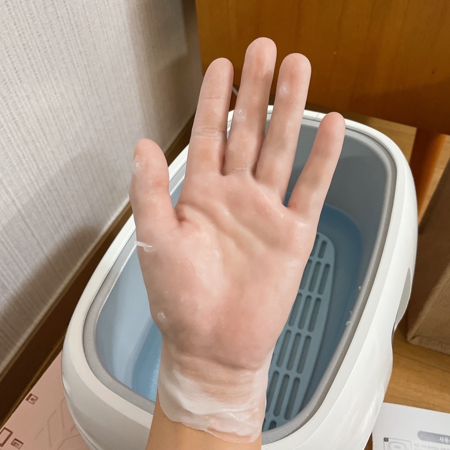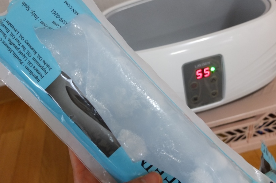 베스 자체가 보온력이 워낙 좋고 열전도성이 낮아서 적정 온도 유지가 잘 되는데 손을 담구었다가 빼보면 겉은 굳으면서 안쪽으로는 열감이 가둬지는 듯해요. 처음에는 신기했는데 지금은 익숙해졌네요. 이렇게 반복해주면서 두껍게 만들어야 더 좋은거고 그 다음에는 비닐팩과 커버를 덮은 다음 20분 정도 그대로 있으면 됩니다.