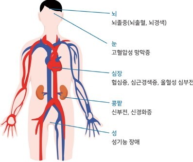 신체의 모든 곳에 악영향을 끼치는데 대표로 뇌출혈, 뇌졸중이 있으며 무리를 주어 신부전을 일으킨다 합니다!