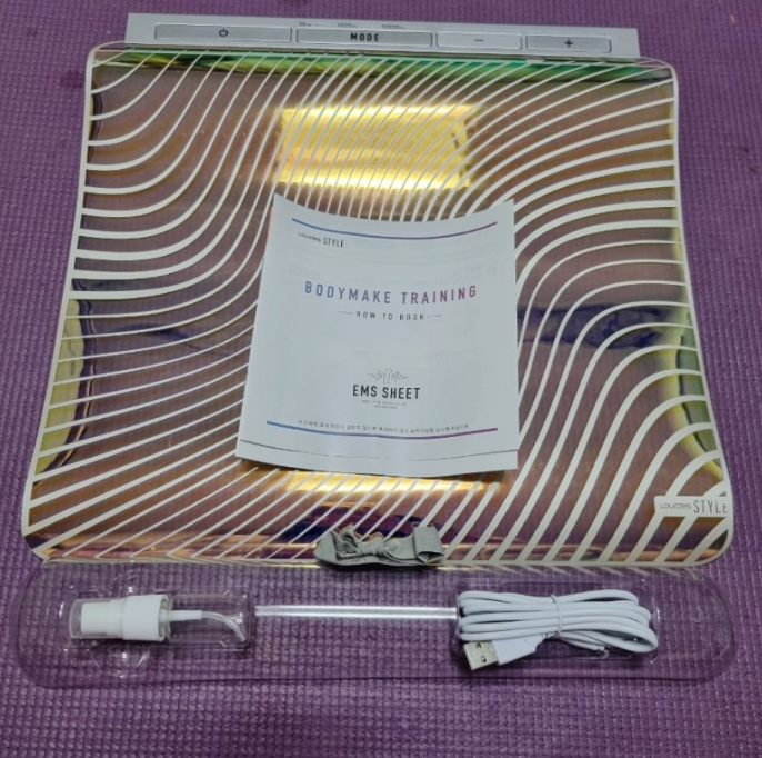 구성품은 본체, 충전기, 고무줄, 미니 분무기